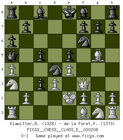 Last move : 0-1 2018 April 28 19:7:26 [Event "FICGS__CHESS__CLASS_E__000208"] [Site "FICGS"] [Date "2018.04.17"] [Round "1"] [White "Klawitter,Bernd"] [Black "de la Foret,Fred"] [Result "0-1"] [WhiteElo "1328"] [BlackElo "1373"] 1.e4 c5 2.c3 Nf6 3.Qf3 Nc6 4.d3 e5 5.Na3 d5 6.Bg5 d4 7.Nb5 Qa5 8.a4 a6 9.Na3 dxc3 10.Ke2 Nd4+ 0-1 Sicilian : Alapin's variation (2.c3) Player Black won this chess game. Follow this game move after move (download)Chess demands total concentration. (Bobby Fischer) Schach ist ein Reich, wo sich die menschliche Phantasie frei entfalten kann. (David Bronstein) El Ajedrez lo es todo: arte, ciencia y deporte. (Anatoly Karpov) J'ai toujours senti une vague pitié pour l'homme qui ne connaît rien aux échecs, tout comme j'en aurais pour un homme ignorant de l'amour. Les Echecs, comme la musique ou comme l'amour, ont le pouvoir de rendre heureux. (Siegbert Tarrasch) Your best chance to get a Royal Flush in a casino is in the bathroom. (Anonymous)