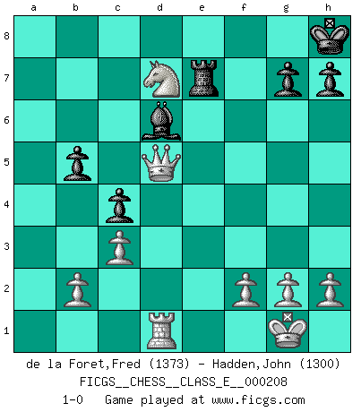 Last move : 1-0 2018 June 21 0:42:51 [Event "FICGS__CHESS__CLASS_E__000208"] [Site "FICGS"] [Date "2018.04.17"] [Round "1"] [White "de la Foret,Fred"] [Black "Hadden,John"] [Result "1-0"] [WhiteElo "1373"] [BlackElo "1300"] 1.e4 e5 2.Nf3 Nc6 3.Bc4 Nf6 4.d3 Be7 5.O-O d6 6.c3 Be6 7.Bb3 O-O 8.Re1 a6 9.Bxe6 fxe6 10.Nbd2 d5 11.exd5 exd5 12.Nxe5 Nxe5 13.Rxe5 Bd6 14.Re1 Qd7 15.Nf3 b5 16.Be3 c5 17.a4 c4 18.axb5 axb5 19.Rxa8 Rxa8 20.Bd4 Rf8 21.Bxf6 Rxf6 22.dxc4 dxc4 23.Qd5+ Rf7 24.Rd1 Kh8 25.Ne5 Re7 26.Nxd7 1-0 Two knights defense (Modern Bishop's Opening) Kingside Castling by player White (move 5) Kingside Castling by player Black (move 7) Player White won this chess game. Follow this game move after move (download)A good player is always lucky. (Jose Raul Capablanca) Deine Wertungszahl - vorausgesetzt einige Jahre schachliche Anstrengung - entspricht etwa dem zehnfachen Deines IQ plus 1000. (Jonathan Levitt) Por tratar de evitar la pérdida de una pieza, muchas personas han perdido una partida de Ajedrez. (Savielly Tartakover) Pour moi, les échecs ne sont pas un jeu mais un art. (Alexandre Alekhine) The difference between perseverance and obstinacy is that one comes from a strong will, and the other from a strong won't. (Henry Ward Beecher)