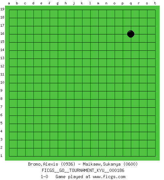 Last move : 1-0 2018 May 17 23:32:52 [Event "FICGS__GO__TOURNAMENT_KYU__000186"] [Site "FICGS"] [Date "2018.04.17"] [Round "1"] [Black "Bromo,Alexis"] [White "Maikaew,Sukanya"] [Result "1-0"] [Rating 1 "0936"] [Rating 2 "0600"] 1.q16 1-0 This go game has been lost on time (started : 2018.04.17 20:37:29) Here are the names of the openings (joseki) played in the four corners : Player Black won this Go (weiqi, baduk) game. Follow this game move after move (download)The comb formation is alive. (Anonymous) The weakness of an artist is dogma. (Josh Waitzkin)