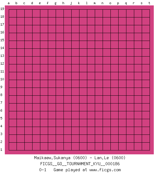 Last move : 0-1 2018 May 17 23:32:52 [Event "FICGS__GO__TOURNAMENT_KYU__000186"] [Site "FICGS"] [Date "2018.04.17"] [Round "1"] [Black "Maikaew,Sukanya"] [White "Lan,Le"] [Result "0-1"] [Rating 1 "0600"] [Rating 2 "0600"] 0-1 This go game has been lost on time (started : 2018.04.17 20:37:29) Here are the names of the openings (joseki) played in the four corners : Player White won this Go (weiqi, baduk) game. Follow this game move after move (download)To emphasize the lack of determination in his moves, one speaks of chance. (Pierre Audouard) That's absurd. I love it. (Gregory House, House M.D.)