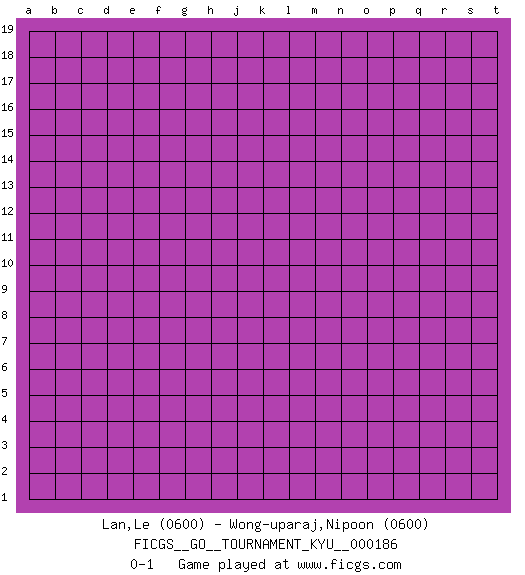 Last move : 0-1 2018 May 17 23:32:52 [Event "FICGS__GO__TOURNAMENT_KYU__000186"] [Site "FICGS"] [Date "2018.04.17"] [Round "1"] [Black "Lan,Le"] [White "Wong-uparaj,Nipoon"] [Result "0-1"] [Rating 1 "0600"] [Rating 2 "0600"] 0-1 This go game has been lost on time (started : 2018.04.17 20:37:29) Here are the names of the openings (joseki) played in the four corners : Player White won this Go (weiqi, baduk) game. Follow this game move after move (download)You have to like to win, and to learn to recognize the errors that gave you the victory. (Pierre Audouard) Success without honor is an unseasoned dish; it will satisfy your hunger, but it won't taste good. (Joe Paterno)