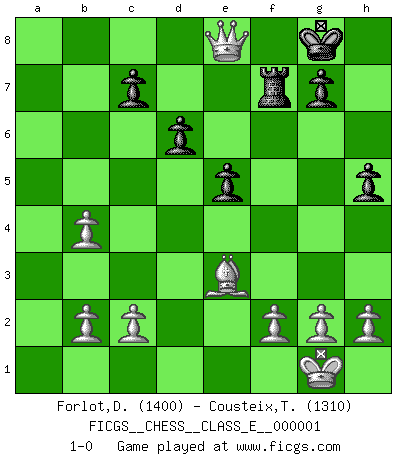 Last move : 1-0 2006 August 1 23:5:20 [Event "FICGS__CHESS__CLASS_E__000001"] [Site "FICGS"] [Date "2006.04.10"] [Round "1"] [White "Forlot,Dominique"] [Black "Cousteix,Thierry"] [Result "1-0"] [WhiteElo "1400"] [BlackElo "1310"] 1.e4 e5 2.Nf3 Nc6 3.Bb5 d6 4.O-O Bd7 5.Re1 a6 6.Ba4 b5 7.Bb3 Nf6 8.Ng5 Nxe4 9.Nxe4 Nd4 10.d3 Nxb3 11.axb3 Be7 12.Be3 O-O 13.Nbc3 Bc6 14.b4 Bxe4 15.dxe4 f5 16.exf5 Rxf5 17.Nd5 Rc8 18.Nxe7+ Qxe7 19.Qd5+ Rf7 20.Rxa6 Qf6 21.Rea1 Qd8 22.Ra8 Rxa8 23.Rxa8 Qxa8 24.Qxa8+ Rf8 25.Qd5+ Rf7 26.Qxb5 h5 27.Qe8+ 1-0 Ruy Lopez : Old Steinitz defense Kingside Castling by player White (move 4) Kingside Castling by player Black (move 12) Player White won this chess game. Follow this game move after move (download)Chess is a cold bath for the mind. (Sir John Simon) Rubinstein ist ein Turmendspiel, welches die Götter vor tausenden von Jahren begannen. (Savielly Grigorievitsch Tartakower) Sin errores no puede haber brillantez. (Emanuel Lasker) Ce qui est bien, c'est d'avoir tout un tas de pièces en prise : l'adversaire ne peut en prendre qu'une à la fois. Cité par Thierry Audin. Mandala - that's it! 16x16 squares as multiple of the four and the eight because of the Four Noble Truths and the Noble Eightfold Path. (Heinz-Georg Lehnhoff about Big Chess)