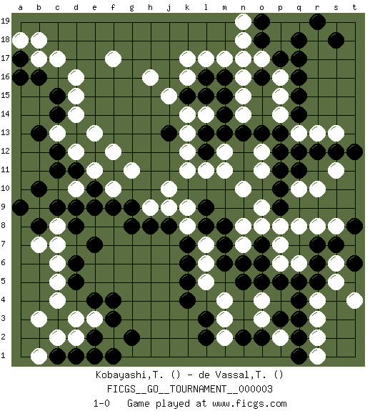 Last move : 1-0 2007 January 22 14:54:19 [Event "FICGS__GO__TOURNAMENT__000003"] [Site "FICGS"] [Date "2006.06.03"] [Round "1"] [Black "Kobayashi,Tetsuya"] [White "de Vassal,Thibault"] [Result "1-0"] 1.q17 c4 2.q4 d16 3.e4 e3 4.f3 d3 5.f4 c6 6.k4 k17 7.c14 f17 8.b16 c17 9.c11 r3 10.q3 r4 11.r5 s5 12.r6 c8 13.e7 n16 14.q15 q13 15.q11 p15 16.q14 p14 17.p13 d10 18.d11 h16 19.q12 d14 20.d13 d15 21.c15 s6 22.r7 r8 23.s7 r2 24.q2 r1 25.e10 p18 26.o13 e13 27.d9 p6 28.p5 m3 29.l3 q8 30.o6 p7 31.o7 o8 32.p9 p8 33.m7 o9 34.p10 n10 35.l9 m11 36.m13 k11 37.l12 l11 38.j13 j10 39.j8 g11 40.g9 m4 41.n5 f12 42.q18 b17 43.d5 c5 44.q1 f2 45.g2 q19 46.r19 p19 47.s18 n8 48.p17 n14 49.n13 n7 50.n6 o17 51.o18 l6 52.m6 k8 53.k7 l7 54.l8 k9 55.k6 l5 56.m8 o3 57.k5 o4 58.o5 q6 59.q5 r13 60.n2 k14 61.s12 s13 62.r12 n18 63.o19 m2 64.o2 p2 65.p3 s8 66.t6 t4 67.l2 k13 68.c9 b9 69.b10 c13 70.b13 d12 71.c12 n19 72.e2 d2 73.f1 r10 74.o16 n17 75.d1 c2 76.c1 b1 77.e1 b3 78.b8 b7 79.a9 p16 80.q16 s11 81.t12 j9 82.h8 h9 83.g8 q10 84.a17 a18 85.a16 o11 86.p11 b18 87.m14 n15 88.l15 k16 89.l16 l17 90.k15 j15 91.t8 k12 92.m16 m17 93.d8 c7 94.d6 l14 95.m15 m12 96.l13 o12 97.p12 f10 98.f9 e11 99.e9 1-0 Comment by player 2 : Thibault de Vassal : Thanks for one of my very first Go lessons :) Best wishes. Here are the names of the openings (joseki) played in the four corners : Corner d4 : c4 e4 Komoku (Somok, Xiao~mu`) 3-4 Point. The komoku (3-4) point is the traditional corner enclosure move.. Ikken Takagakari (Hankan Nop'dakeolch'im, Yi Gaogua`jiao~, 1-Space High Approach). The 5-4 approach move has become more popular in modern times, as modern Go emphasizes speed and influence. Corner d16 : d16 c14 Hoshi (Hwajeom, Seongjeom, Xingwei`) 4-4 Point. The star or hoshi (4-4) point, emphasizing influence at the potential expense of territory. Ikken Kakari (Hankan Keolch'im, Yi Gua`jiao~, 1-Space Low Approach). Black 2 is the standard approach move to the 4-4. Corner q4 : q4 r3 Hoshi (Hwajeom, Seongjeom, Xingwei`) 4-4 Point. The star or hoshi (4-4) point, emphasizing influence at the potential expense of territory. Corner q16 : q17 n16 Komoku (Somok, Xiao~mu`) 3-4 Point. The komoku (3-4) point is the traditional corner enclosure move.. Player Black won this Go (weiqi, baduk) game. Follow this game move after move (download)If you don't know ladders, don't play go. (Anonymous) Unless in communicating with it one says exactly what one means, trouble is bound to result. (Alan Turing, about computers)