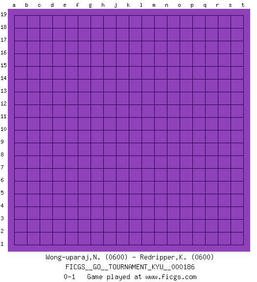 Last move : 0-1 2018 May 17 23:32:52 [Event "FICGS__GO__TOURNAMENT_KYU__000186"] [Site "FICGS"] [Date "2018.04.17"] [Round "1"] [Black "Wong-uparaj,Nipoon"] [White "Redripper,Kevin"] [Result "0-1"] [Rating 1 "0600"] [Rating 2 "0600"] 0-1 This go game has been lost on time (started : 2018.04.17 20:37:29) Here are the names of the openings (joseki) played in the four corners : Player White won this Go (weiqi, baduk) game. Follow this game move after move (download)Error is one of the sources of transformation. (Pierre Audouard) The next best thing to gambling and winning is gambling and loosing. (Nick Dandalos)