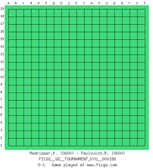 Last move : 0-1 2018 May 17 23:32:52 [Event "FICGS__GO__TOURNAMENT_KYU__000186"] [Site "FICGS"] [Date "2018.04.17"] [Round "1"] [Black "Redripper,Kevin"] [White "Pavlovich,Ruslan"] [Result "0-1"] [Rating 1 "0600"] [Rating 2 "0600"] 0-1 This go game has been lost on time (started : 2018.04.17 20:37:29) Here are the names of the openings (joseki) played in the four corners : Player White won this Go (weiqi, baduk) game. Follow this game move after move (download)Never try to cut bamboo joints. (Anonymous) You must do what you feel is right... of course. (Obi-Wan Kenobi in Star Wars ep.4)