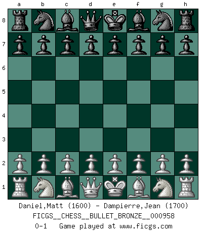 Last move : 0-1 2018 April 18 9:10:32 [Event "FICGS__CHESS__BULLET_BRONZE__000958"] [Site "FICGS"] [Date "2018.04.18"] [Round "1"] [White "Daniel,Matt"] [Black "Dampierre,Jean"] [Result "0-1"] [WhiteElo "1600"] [BlackElo "1700"] 0-1 This chess game has been lost on time (started : 2018.04.18 0:53:46) Player Black won this chess game. Follow this game move after move (download)All I want to do, ever, is just play Chess. (Bobby Fischer) Ein typischer, sehr verbreiteter Gedankenschädling ist der, daß der betreffende Amateur von der Annanhme ausgeht, daß jeder einzelne Zug etwas zu leisten habe. (Aaron Nimzowitsch) Desconfianza es la característica mas necesaria de un jugador de Ajedrez. (Siegbert Tarrasch) Aucun coup ne doit être joué sans but. (Pedro Damiano) There are two major products that came out of Berkeley: LSD and UNIX. We do not believe this is to be a coincidence. (Jeremy S. Anderson)