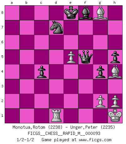 Last move : 1/2-1/2 2018 May 6 14:29:35 [Event "FICGS__CHESS__RAPID_M__000093"] [Site "FICGS"] [Date "2018.04.18"] [Round "1"] [White "Monotua,Rotom"] [Black "Unger,Peter"] [Result "1/2-1/2"] [WhiteElo "2238"] [BlackElo "2235"] 1.d4 Nf6 2.c4 e6 3.Nf3 d5 4.Nc3 c6 5.Bg5 h6 6.Bh4 dxc4 7.e4 g5 8.Bg3 b5 9.Be2 Bb7 10.e5 Nd5 11.O-O Qb6 12.Ne4 Nd7 13.Rc1 g4 14.Nh4 h5 15.b3 cxb3 16.axb3 a5 17.Qd2 a4 18.bxa4 Rxa4 19.Rcd1 Rg8 20.f4 Kd8 21.f5 c5 22.Ng5 Ke8 23.Nxf7 Rxd4 24.Qb2 Rxd1 25.Rxd1 Kxf7 26.fxe6+ Kxe6 27.Bxb5 c4 28.Kh1 Bc6 29.Bxc6 Qxb2 30.Bxd5+ Ke7 31.Bxg8 Qc2 32.Nf5+ Qxf5 33.Bh4+ Ke8 1/2-1/2 Queen's pawn game Kingside Castling by player White (move 11) This chess game ended in a draw. Follow this game move after move (download)A man that will take back a move at Chess will pick a pocket. (Richard Fenton) Als ich elf wurde, wurde ich einfach gut. (Robert James Fischer) Fischer es una tragedia del Ajedrez Americano a la par con Morphy y Pillsbury. (Mig Greengard) Echiquier : carré parfait, comme la Jérusalem nouvelle décrite par l'auteur de l'Apocalypse, huit cases sur huit, exaltation du chiffre 4, symbole du cosmos aux quatre horizons... où le noir et le blanc, l'ombre et la lumière, le mal et le bien s'entremêlent et se conjuguent. (Robert Couffignal, Le Gambit du poète) Panic is a sudden desertion of us, an a going over to the enemy of our imagination. (Christian Nevell Bovee)