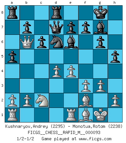 Last move : 1/2-1/2 2018 July 28 20:52:45 [Event "FICGS__CHESS__RAPID_M__000093"] [Site "FICGS"] [Date "2018.04.18"] [Round "1"] [White "Kushnaryov,Andrey"] [Black "Monotua,Rotom"] [Result "1/2-1/2"] [WhiteElo "2295"] [BlackElo "2238"] 1.Nf3 Nf6 2.d4 g6 3.g3 Bg7 4.Bg2 O-O 5.O-O d5 6.Ne5 c6 7.c4 dxc4 8.Nxc4 Be6 9.Nba3 Qc8 10.e4 Rd8 11.Bg5 Na6 12.Re1 Nc7 13.Ne5 h6 14.Be3 Ng4 15.Nxg4 Bxg4 16.Qd2 h5 17.Qb4 Qd7 18.f3 Bh3 19.Nc2 a5 20.Qb6 Be6 21.Bf1 Ne8 22.Bf2 Nd6 1/2-1/2 Reti Opening Kingside Castling by player Black (move 4) Kingside Castling by player White (move 5) This chess game ended in a draw. Follow this game move after move (download)The stomach is an essential part of the Chess master. (Bent Larsen) Ein Schachgenie ist jemand der verdammt gut Schach spielt. (Jonathan Levitt) En el Ajedrez, tal como es jugado por los Maestros, practicamente la suerte es eliminada. (Emanuel Lasker) Il n'y a pas eu de défaite parce que je ne crois pas que cet ordinateur ait jamais existé. IBM a triché en refusant d'imprimer les modes de recherche de la machine. C'est évident, pendant le match, des coups décisifs ont été joués par des êtres humains. Aujourd'hui, les meilleurs spécialistes en informatique ne peuvent toujours pas expliquer comment Deep-Blue a pu jouer contre la logique des ordinateurs. IBM a gagné une guerre de communication, mais ils sont incapables de prouver que l'ordinateur a gagné tout seul. (Garry Kasparov) At last I discovered the true beauty of chess. So I proposed to her. (Dinesh De Silva)