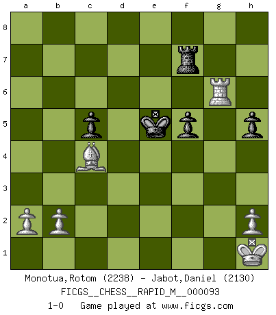 Last move : 1-0 2018 September 3 13:35:2 [Event "FICGS__CHESS__RAPID_M__000093"] [Site "FICGS"] [Date "2018.04.18"] [Round "1"] [White "Monotua,Rotom"] [Black "Jabot,Daniel"] [Result "1-0"] [WhiteElo "2238"] [BlackElo "2130"] 1.d4 d5 2.c4 c6 3.Nc3 e6 4.e4 dxe4 5.Nxe4 Bb4+ 6.Bd2 Be7 7.Nf3 Nf6 8.Bd3 Nbd7 9.Qe2 Nxe4 10.Bxe4 Nf6 11.Bc2 a5 12.Ne5 a4 13.O-O Qc7 14.Bf4 Qd8 15.Rad1 Kf8 16.g4 Nd7 17.Be3 Qe8 18.f4 Kg8 19.f5 h6 20.Bd2 Nf6 21.Rde1 exf5 22.gxf5 Bf8 23.Qg2 Qd8 24.Kh1 Ra6 25.Rg1 Bd7 26.Re2 Be8 27.Be1 c5 28.d5 h5 29.Bh4 Qc7 30.Nc6 Bxc6 31.Bxf6 Bxd5 32.cxd5 Rxf6 33.Re8 Rh7 34.d6 Qxd6 35.Qxb7 g6 36.Rd1 Qc6+ 37.Qxc6 Rxc6 38.R1d8 Kg7 39.Rxf8 gxf5 40.Bxa4 Rb6 41.Bb3 Kf6 42.Rd2 Rc6 43.Bc4 Ke7 44.Rfd8 Rg6 45.R2d7+ Kf6 46.Rxf7+ Rxf7 47.Rd6+ Ke5 48.Rxg6 1-0 QGD Slav defense Kingside Castling by player White (move 13) Player White won this chess game. Follow this game move after move (download)Bobby Fischer's current state of mind is indeed a tragedy. One of the world's greatest Chess players - the pride and sorrow of American Chess. (Frank Brady) Man gibt nur Pakete auf. (Paul Keres) Botvinnik trataba de restarle el misterio al Ajedrez, siempre relacionandolo a situaciones de la vida ordinaria. El gustaba de llamar al Ajedrez un típico problema inexacto similar a aquellos de los cuales la gente siempre tiene que enfrentarse en la vida cotidiana. (Garry Kasparov) Nous vivons dans un monde échiquéen : chaque jour qui passe est un défi à relever. (Philosophe Sasha) Everybody lies. (Gregory House, House M.D.)