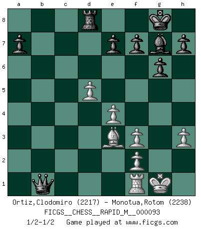 Last move : 1/2-1/2 2018 May 10 13:24:14 [Event "FICGS__CHESS__RAPID_M__000093"] [Site "FICGS"] [Date "2018.04.18"] [Round "1"] [White "Ortiz,Clodomiro"] [Black "Monotua,Rotom"] [Result "1/2-1/2"] [WhiteElo "2217"] [BlackElo "2238"] 1.Nf3 Nf6 2.c4 g6 3.d4 Bg7 4.Nc3 d5 5.cxd5 Nxd5 6.e4 Nxc3 7.bxc3 c5 8.Be3 Bg4 9.Rc1 O-O 10.Be2 Qa5 11.O-O Qxa2 12.Rb1 cxd4 13.cxd4 Nc6 14.Rxb7 Rab8 15.Rc7 Rfc8 16.Rxc8+ Rxc8 17.h3 Bxf3 18.Bxf3 Rd8 19.d5 Ne5 20.Qb1 Nxf3+ 21.gxf3 Qxb1 1/2-1/2 Reti Opening Kingside Castling by player Black (move 9) Kingside Castling by player White (move 11) This chess game ended in a draw. Follow this game move after move (download)Excellence at Chess is one mark of a scheming mind. (Sir Arthur Conan Doyle) Es gibt Leute, die glauben, alles wäre vernünftig, was man mit einem ernsthaften Gesicht tut. (Georg Christoph Lichtenberg) Un mal día en el Ajedrez, es mejor que cualquier buen día en el trabajo. (Anonymous) Les échecs sont utiles à l'exercice de la faculté de penser et à celle de l'imagination. Car nous devons posséder une méthode élaborée pour atteindre des buts partout où nous devons conduire notre raison. (Leibnitz) There is a very easy way to return from a casino with a small fortune : go there with a large one. (Jack Yelton)