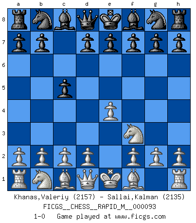 Last move : 1-0 2018 May 19 23:36:18 [Event "FICGS__CHESS__RAPID_M__000093"] [Site "FICGS"] [Date "2018.04.18"] [Round "1"] [White "Khanas,Valeriy"] [Black "Sallai,Kalman"] [Result "1-0"] [WhiteElo "2157"] [BlackElo "2135"] 1.e4 c5 2.Nf3 1-0 This chess game has been lost on time (started : 2018.04.18 17:7:56) Sicilian defense Player White won this chess game. Follow this game move after move (download)If Chess is a science, it's a most inexact one. If Chess is an art, it is too exacting to be seen as one. If Chess is a sport, it's too esoteric. If Chess is a game, it's too demanding to be just a game. If Chess is a mistress, she's a demanding one. If Chess is a passion, it's a rewarding one. If Chess is life, it's a sad one. (Unknown) Der Freibauer hat für mich eine Seele, genau wie der Mensch, Wünsche, die unerkannt in ihm schlummern, und Befürchtungen, von deren Existenz er selbst kaum ahnt. (Aaron Nimzowitsch) Los Peones son el alma de una partida de Ajedrez. (Francois Andre Danican Philidor) On est toujours la mazette de quelqu'un d'autre. (Anonyme) Heh, heh, heh. Time to abandon ship. (General Grievous in Star Wars ep.3)