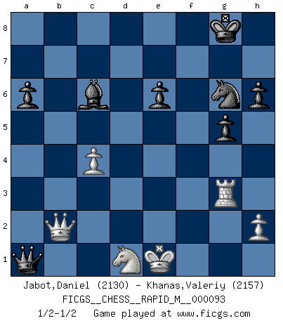 Last move : 1/2-1/2 2018 June 30 14:17:18 [Event "FICGS__CHESS__RAPID_M__000093"] [Site "FICGS"] [Date "2018.04.18"] [Round "1"] [White "Jabot,Daniel"] [Black "Khanas,Valeriy"] [Result "1/2-1/2"] [WhiteElo "2130"] [BlackElo "2157"] 1.e4 c5 2.Nf3 d6 3.d4 cxd4 4.Nxd4 Nf6 5.Nc3 a6 6.Bg5 e6 7.f4 Qb6 8.Qd2 Qxb2 9.Rb1 Qa3 10.e5 h6 11.Bh4 dxe5 12.fxe5 Nfd7 13.Ne4 Qxa2 14.Rd1 Qd5 15.Qe3 Qxe5 16.Be2 Bc5 17.Bg3 Qd5 18.c4 Bxd4 19.Rxd4 Qa5+ 20.Rd2 O-O 21.Bd6 f5 22.Bxf8 Nxf8 23.Nd6 Nbd7 24.g4 fxg4 25.Bxg4 Ne5 26.Rg1 Bd7 27.Nxb7 Nxg4 28.Rxg4 Qf5 29.Rdg2 g6 30.Nc5 Bc6 31.Ne4 Rb8 32.Rf2 Rb1+ 33.Kd2 Qa5+ 34.Nc3 g5 35.Rg3 Rb2+ 36.Ke1 Qa1+ 37.Nd1 Rxf2 38.Qxf2 Ng6 39.Qb2 1/2-1/2 Sicilian : Najdorf, 7...Qb6 Kingside Castling by player Black (move 20) This chess game ended in a draw. Follow this game move after move (download)You cannot play at Chess if you are kind-hearted. (French Proverb) Wer sich die Fähigkeit anerziehen will im Schach selbstständig zu denken, der muß alles meiden, was leblos ist: ausgeklügelte Theorien, die sich auf sehr wenige Beispiele und eine Menge Hirngespinste stützen. (Emanuel Lasker) Los tropiezos estan todos ahí en el tablero, esperando que se cometan. (Savielly Tartakover) Des idées, des idées, j'en ai cent, j'en ai mille. Des bonnes, des mauvaises, applicables, irréalisables... Il suffit de faire le tri ! (Roos) All men can see these tactics whereby I conquer, but what none can see is the strategy out of which victory is evolved. (Sun Tzu)