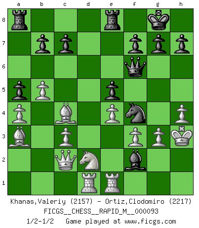 Last move : 1/2-1/2 2018 April 25 14:4:18 [Event "FICGS__CHESS__RAPID_M__000093"] [Site "FICGS"] [Date "2018.04.18"] [Round "1"] [White "Khanas,Valeriy"] [Black "Ortiz,Clodomiro"] [Result "1/2-1/2"] [WhiteElo "2157"] [BlackElo "2217"] 1.e4 e5 2.Nf3 Nc6 3.Bc4 Bc5 4.c3 Nf6 5.d3 d6 6.O-O O-O 7.b4 Bb6 8.a4 a5 9.b5 Ne7 10.Nbd2 Ng6 11.d4 Bg4 12.Qc2 Nf4 13.dxe5 Nd7 14.Ba3 Re8 15.g3 Nh3+ 16.Kg2 Nxe5 17.Nxe5 dxe5 18.f3 Bc8 19.Rad1 Ng5 20.h4 Bh3+ 21.Kh1 Ne6 22.Rfe1 Qf6 23.Kh2 Bf2 24.Kxh3 Nf4+ 1/2-1/2 Giuoco Piano Kingside Castling by player White (move 6) Kingside Castling by player Black (move 6) This chess game ended in a draw. Follow this game move after move (download)Kasparov : J'adoube , Ivanchuk : S'il vous plaît ! (Garry Kasparov & Vassily Ivanchuk, Linares 1997) Ich würde die 30 stärksten Spieler der USA im Simultanspiel besiegen. (José Raúl Capablanca) Combinaciones deslumbrantes son para la mayorÃa, mover madera es para los pocos. (Georg Kieninger) Le temps de noter son nom sur la feuille de partie, j'étais déjà en zeitnot ! D'un modeste amateur apparié lors de la première ronde d'un open contre le grand-maître Azmaïparashvili. A computer lets you make more mistakes faster than any invention in human history - with the possible exceptions of handguns and tequila. (Mitch Ratcliffe)
