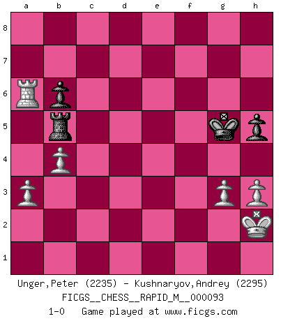 Last move : 1-0 2018 June 28 10:52:27 [Event "FICGS__CHESS__RAPID_M__000093"] [Site "FICGS"] [Date "2018.04.18"] [Round "1"] [White "Unger,Peter"] [Black "Kushnaryov,Andrey"] [Result "1-0"] [WhiteElo "2235"] [BlackElo "2295"] 1.d4 Nf6 2.Nf3 e6 3.c4 d5 4.Nc3 Bb4 5.Bg5 dxc4 6.e4 c5 7.Bxc4 cxd4 8.Nxd4 Qa5 9.Bd2 Qc5 10.Bb5+ Bd7 11.Nb3 Qe7 12.Bd3 Nc6 13.O-O O-O 14.a3 Bd6 15.Kh1 Ne5 16.Bg5 h6 17.Bxf6 gxf6 18.f4 Nxd3 19.Qxd3 Bc7 20.Nd4 Bb6 21.Rf3 Rfd8 22.Rh3 Bxd4 23.Qxd4 e5 24.Rg3+ Kh7 25.Qf2 Be6 26.fxe5 fxe5 27.Rf3 Rd6 28.Nd5 Bxd5 29.exd5 Rf8 30.Rd1 f6 31.h3 b6 32.Qc2+ e4 33.Rf5 Re8 34.Rdf1 Kg7 35.Qe2 Qf7 36.Qe1 Qg6 37.R1f4 h5 38.Rxe4 Rxe4 39.Qxe4 Rd7 40.Qf3 Re7 41.Kh2 Re3 42.Rxf6 Qe8 43.Qf4 Qe5 44.Rf7+ Kg6 45.Qxe5 Rxe5 46.Rxa7 Rxd5 47.Ra6 Rb5 48.b4 Kg5 49.g3 1-0 Queen's pawn game Kingside Castling by player White (move 13) Kingside Castling by player Black (move 13) 10 pieces endgame at move 46 : White KRPPPP , Black KRPP WHITE : King + 1 Rook 4 Pawns BLACK : King + 1 Rook 2 Pawns Player White won this chess game. Follow this game move after move (download)In Chess, as it is played by masters, chance is practically eliminated. (Emanuel Lasker) Ich war zu klein für die Schach-Schülermannschaft! (Woody Allen) Debemos de asegurarnos de que el Ajedrez no se convierta en un lenguaje muerto, muy interesante, pero solo para un grupo muy pequeño. (Sytze Faber) On n'a jamais que l'âge auquel on a commence à jouer aux échecs car après on cesse de vieillir. (Capablanca) Men should grow up. - Yeah. And dogs should stop licking themselves. It's not gonna happen. (Gregory House to Dr. Cameron, House M.D.)