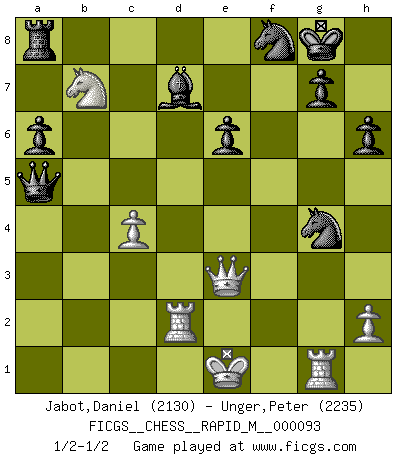 Last move : 1/2-1/2 2018 June 5 21:23:6 [Event "FICGS__CHESS__RAPID_M__000093"] [Site "FICGS"] [Date "2018.04.18"] [Round "1"] [White "Jabot,Daniel"] [Black "Unger,Peter"] [Result "1/2-1/2"] [WhiteElo "2130"] [BlackElo "2235"] 1.e4 c5 2.Nf3 d6 3.d4 cxd4 4.Nxd4 Nf6 5.Nc3 a6 6.Bg5 e6 7.f4 Qb6 8.Qd2 Qxb2 9.Rb1 Qa3 10.e5 h6 11.Bh4 dxe5 12.fxe5 Nfd7 13.Ne4 Qxa2 14.Rd1 Qd5 15.Qe3 Qxe5 16.Be2 Bc5 17.Bg3 Qd5 18.c4 Bxd4 19.Rxd4 Qa5+ 20.Rd2 O-O 21.Bd6 f5 22.Bxf8 Nxf8 23.Nd6 Nbd7 24.g4 fxg4 25.Bxg4 Ne5 26.Rg1 Bd7 27.Nxb7 Nxg4 1/2-1/2 Sicilian : Najdorf, 7...Qb6 Kingside Castling by player Black (move 20) This chess game ended in a draw. Follow this game move after move (download)Chess is a fighting game which is purely intellectual and includes chance. (Richard Reti) Sicherlich können nur Meister einen Stil haben. Daß ein nicht-Meister auch nur ein einziges Mal in seinem Leben eine Partie folgerecht durchführte, habe ich niemals bemerkt. (Emanuel Lasker) El muchacho (en ese entonces un niño de 12 años llamado Anatoly Karpov) no tiene ni idea de lo que es el Ajedrez y no hay futuro en absoluto para el en esta profesión. (Mikhail Botvinnik) Mais l'homme est une créature légère et illogique : semblable au joueur d'échecs, il n'aime que le processus du but à atteindre, non le but lui-même. (Dostoïevsky) He who defends everything defends nothing. (Frederick the Great)