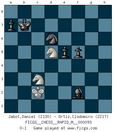 Last move : 0-1 2018 August 16 12:40:59 [Event "FICGS__CHESS__RAPID_M__000093"] [Site "FICGS"] [Date "2018.04.18"] [Round "1"] [White "Jabot,Daniel"] [Black "Ortiz,Clodomiro"] [Result "0-1"] [WhiteElo "2130"] [BlackElo "2217"] 1.d4 Nf6 2.c4 e6 3.Nf3 d5 4.Nc3 c6 5.Bg5 h6 6.Bh4 dxc4 7.e4 g5 8.Bg3 b5 9.Be2 Bg7 10.e5 Nd5 11.Ne4 O-O 12.Qc2 g4 13.Nfd2 Nd7 14.b3 c3 15.Nxc3 Nb4 16.Qc1 c5 17.Nxb5 Ba6 18.a3 Nd5 19.O-O cxd4 20.Nxd4 Bxe2 21.Nxe2 Nxe5 22.Ra2 Rc8 23.Rc2 Rxc2 24.Qxc2 Ng6 25.Nc4 Qd7 26.f3 h5 27.fxg4 hxg4 28.Qd2 Qb5 29.Nc1 f5 30.Re1 Nf6 31.a4 Qe8 32.Nd6 Qe7 33.Ne2 Nd5 34.Nc4 Rd8 35.Qc2 Nb4 36.Qb1 Rd3 37.Rd1 Qd8 38.Bd6 Ne5 39.Rxd3 Nbxd3 40.Bxe5 Nxe5 41.Qc2 Nd3 42.Kf1 Nc5 43.Nd2 Qd6 44.b4 Nd7 45.b5 Kh7 46.h3 Ne5 47.hxg4 Nxg4 48.Ke1 Qb6 49.Nf3 Qf2+ 50.Kd2 Bh6+ 51.Kc3 Ne3 52.Qd3 Qxg2 53.Nd2 Nd5+ 54.Kb3 Qg4 55.Nc4 Bg7 56.Nc1 Kg8 57.a5 Qg1 58.Na2 Qc5 59.Na3 Bf6 60.Nb1 Kf7 61.a6 Be7 62.Nac3 Ne3 63.Ka2 Nc4 64.Qd1 Bd6 65.Qh5+ Ke7 66.Qh7+ Kd8 67.Qh8+ Kd7 68.Qg7+ Be7 69.Qg2 Nd6 70.Qd2 Bf6 71.Kb3 Bd4 72.Qe2 e5 73.Qh5 Qc4+ 74.Kc2 Kc7 75.Qe2 Qxe2+ 76.Nxe2 Nxb5 77.Ng3 Nd6 78.Ne2 Bf2 79.Nbc3 Kb6 80.Nd5+ Kxa6 81.Nec3 Kb7 0-1 Queen's pawn game Kingside Castling by player Black (move 11) Kingside Castling by player White (move 19) 10 pieces endgame at move 76 : White KNNP , Black KBNPPP WHITE : King + 2 Knights 1 Pawn BLACK : King + 1 Bishop 1 Knight 3 Pawns 9 pieces endgame at move 80 : White KNN , Black KBNPPP WHITE : King + 2 Knights BLACK : King + 1 Bishop 1 Knight 3 Pawns Player Black won this chess game. Follow this game move after move (download)All I want to do, ever, is just play Chess. (Bobby Fischer) Es macht mich traurig, wenn ich sehe, dass Golfprofis mehr verdienen als Schachsportler. Obwohl ich davon überzeugt bin, dass wir Schachspieler viel härter trainieren müssen als die Golfer. (Alexandra Kosteniuk) El Ajedrez es tan inspirador que yo no creo que un buen jugador sea capaz de tener un pensamiento malo durante una partida. (Wilhelm Steinitz) Il vaut mieux sacrifier les pièces de l'adversaire. (Xavier Tartacover) Programming can only do so much before it becomes too much. (Don Groves)