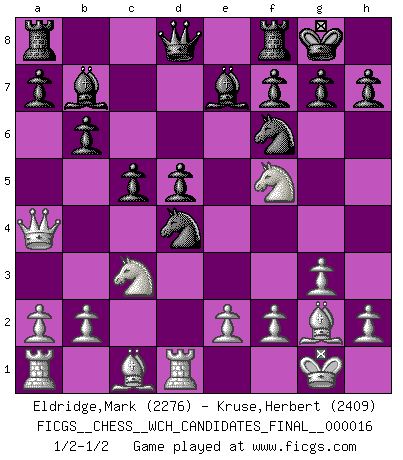 Last move : 1/2-1/2 2018 April 28 16:10:9 [Event "FICGS__CHESS__WCH_CANDIDATES_FINAL__000016"] [Site "FICGS"] [Date "2018.04.18"] [Round "2"] [White "Eldridge,Mark"] [Black "Kruse,Herbert"] [Result "1/2-1/2"] [WhiteElo "2276"] [BlackElo "2409"] 1.d4 Nf6 2.c4 e6 3.Nf3 b6 4.g3 Ba6 5.Qc2 c5 6.d5 exd5 7.cxd5 Bb7 8.Bg2 Nxd5 9.O-O Nc6 10.Rd1 Be7 11.Qa4 Nf6 12.Nh4 O-O 13.Nf5 d5 14.Nc3 Nd4 1/2-1/2 Queen's Indian : Nimzovich variation (exaggerated Fianchetto) Kingside Castling by player White (move 9) Kingside Castling by player Black (move 12) This chess game ended in a draw. Follow this game move after move (download)Help your pieces so they can help you. (Paul Morphy) Je mehr ich von der FIDE weiss, um so weniger verstehe ich. (Alexander Kalifman) Los finales de Peón son del Ajedrez lo que el cesped es del Golf. (Cecil Purdy) Demandez au pauvre Cg1 ce qu'il en pense. Eduard Gufeld à propos de la variante Saemisch de l'Est-Indienne. Life is verb, not a noun. (Charlotte Perkins Gilman)