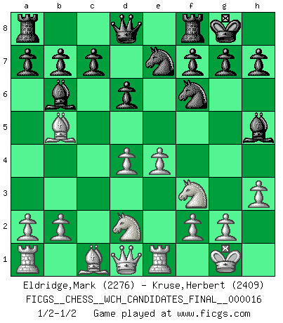 Last move : 1/2-1/2 2018 April 28 23:26:32 [Event "FICGS__CHESS__WCH_CANDIDATES_FINAL__000016"] [Site "FICGS"] [Date "2018.04.18"] [Round "4"] [White "Eldridge,Mark"] [Black "Kruse,Herbert"] [Result "1/2-1/2"] [WhiteElo "2276"] [BlackElo "2409"] 1.e4 e5 2.Nf3 Nc6 3.Bb5 Nf6 4.d3 Bc5 5.c3 O-O 6.O-O d6 7.Nbd2 Ne7 8.d4 exd4 9.cxd4 Bb6 10.Re1 Bg4 11.h3 Bh5 1/2-1/2 Ruy Lopez : Berlin defense Kingside Castling by player Black (move 5) Kingside Castling by player White (move 6) This chess game ended in a draw. Follow this game move after move (download)If your opponent cannot do anything active, then don't rush the position; instead you should let him sit there, suffer, and beg you for a draw. (Jeremy Silman) Ich bin der einzige Schachspieler, der sich während der Vorbereitungen zum Turnier verletzt hat. (Woody Allen) Sin errores no puede haber brillantez. (Emanuel Lasker) Pour se monter efficace, un Cavalier a besoin d'avant-postes ! Les Cavaliers font les meilleurs bloqueurs de pions passés. True nature is revealed in times of difficulty. (Chinese proverb)
