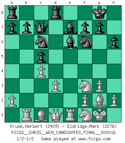 Last move : 1/2-1/2 2018 May 4 23:45:16 [Event "FICGS__CHESS__WCH_CANDIDATES_FINAL__000016"] [Site "FICGS"] [Date "2018.04.18"] [Round "5"] [White "Kruse,Herbert"] [Black "Eldridge,Mark"] [Result "1/2-1/2"] [WhiteElo "2409"] [BlackElo "2276"] 1.Nf3 d5 2.g3 c5 3.Bg2 Nf6 4.O-O e6 5.d3 Nc6 6.Nbd2 Be7 7.e4 O-O 8.Re1 Qc7 9.exd5 exd5 10.Nf1 d4 11.c3 dxc3 12.bxc3 h6 13.Rb1 Rd8 14.c4 Be6 15.Bf4 Bd6 16.Bc1 Be7 1/2-1/2 Reti : King's Indian attack Kingside Castling by player White (move 4) Kingside Castling by player Black (move 7) This chess game ended in a draw. Follow this game move after move (download)Bobby is the most misunderstood, misquoted celebrity walking the face of this earth. (Yasser Seirawan) Ohne Fehler kann es keine Brillanz geben. (Emanuel Lasker) Después de una mala apertura, hay una esperanza en el juego medio. Pero una vez que estas en finales, el momento de la verdad ha llegado. (Edmar Mednis) Les réformistes prétendent que les progrès de la théorie conduiront à la disparition des échecs, et qu'il faut, pour leur rendre vie, en remanier les règles. En réalité, qu'exprime cette affirmation? Le mépris de l'intuition, de l'imagination et de tous les autres éléments qui font des échecs un art. (Alexander Alekhine) There will be no order, only chaos. (Sol Robeson in Pi by Darren Aronofsky)