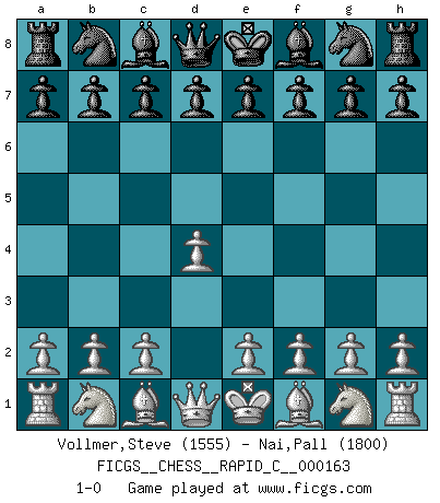 Last move : 1-0 2018 May 20 23:41:51 [Event "FICGS__CHESS__RAPID_C__000163"] [Site "FICGS"] [Date "2018.04.20"] [Round "1"] [White "Vollmer,Steve"] [Black "Nai,Pall"] [Result "1-0"] [WhiteElo "1555"] [BlackElo "1800"] 1.d4 1-0 This chess game has been lost on time (started : 2018.04.20 21:7:25) Queen's pawn Player White won this chess game. Follow this game move after move (download)It is not enough to be a good player... you must also play well. (Siegbert Tarrasch) Der Umstand, daß uns eine 7 Stunden Zeitkontrolle ermöglicht eine großartige, tiefe Partie zu spielen, ist für die Massenmedien nicht weiter von Bedeutung. (Alexej Shirov) Los errores estan ahí, esperando a que se cometan. (Savielly Tartakower) Ce qui est bien, c'est d'avoir tout un tas de pièces en prise : l'adversaire ne peut en prendre qu'une à la fois. Cité par Thierry Audin. Establishing goals is all right if you don't let them deprive you of interesting detours. (Doug Larson)