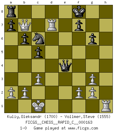 Last move : 1-0 2018 June 2 11:55:18 [Event "FICGS__CHESS__RAPID_C__000163"] [Site "FICGS"] [Date "2018.04.20"] [Round "1"] [White "Kuliy,Oleksandr"] [Black "Vollmer,Steve"] [Result "1-0"] [WhiteElo "1700"] [BlackElo "1555"] 1.d4 Nf6 2.Bf4 e6 3.e3 d5 4.Nd2 c5 5.c3 Nc6 6.Ngf3 Bd6 7.Bg3 O-O 8.Bd3 b6 9.e4 Bxg3 10.hxg3 e5 11.dxe5 dxe4 12.Nxe4 Re8 13.Nxf6+ Qxf6 14.Bxh7+ Kf8 15.Be4 Rxe5 16.Nxe5 Qxe5 17.Qe2 Bb7 18.O-O-O g6 19.Rd7 Ba6 20.Qxa6 Qxe4 21.Qb7 1-0 Queen's pawn game Kingside Castling by player Black (move 7) Queenside Castling by player White (move 18) Player White won this chess game. Follow this game move after move (download)You may learn much more from a game you lose than from a game you win. You will have to lose hundreds of games before becoming a good player. (Jose Raul Capablanca) Konzentriere dich auf materielle Gewinne. Nimm, was dir dein Gegner gibt, ausser es gibt einen guten Grund der dagegenspricht. (Robert James Fischer) Morphy probablemente fue el genio más grande de todos. (Bobby Fischer) Votre prénom est 'Tactique', votre deuxième prénom est 'Tactique' et votre nom est 'Tactique'. (Ken Smith) Art is the only way to run away without leaving home. (Twyla Tharp)