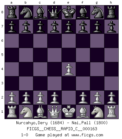Last move : 1-0 2018 May 22 23:48:54 [Event "FICGS__CHESS__RAPID_C__000163"] [Site "FICGS"] [Date "2018.04.20"] [Round "1"] [White "Nurcahyo,Dery"] [Black "Nai,Pall"] [Result "1-0"] [WhiteElo "1684"] [BlackElo "1800"] 1.e4 1-0 This chess game has been lost on time (started : 2018.04.20 21:7:25) King's pawn Opening Player White won this chess game. Follow this game move after move (download)I still hope to kill Fischer. (Boris Spassky) Glücklicherweise sind Großmeister Ruben Fines reine Schachbücher weniger phallozentrisch [als seine Schachpsychologie] und deswegen auch weniger lächerlich. (Nigel Short) Buenas posiciones no logran ganar juegos, buenas movidas sí. (Gerald Abrahams) La victoire dans une partie d'Echecs appartient la plupart du temps à celui qui voit un peu plus loin que l'adversaire. (Lasker) I feel so... helpless. (C-3PO in Star Wars ep.3)