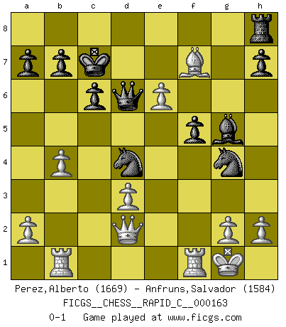 Last move : 0-1 2018 May 14 21:57:35 [Event "FICGS__CHESS__RAPID_C__000163"] [Site "FICGS"] [Date "2018.04.20"] [Round "1"] [White "Perez,Alberto"] [Black "Anfruns,Salvador"] [Result "0-1"] [WhiteElo "1669"] [BlackElo "1584"] 1.e4 e5 2.Nf3 Nf6 3.d3 Nc6 4.Be2 d5 5.exd5 Nxd5 6.O-O Bf5 7.Ng5 Be7 8.Ne4 Nd4 9.Nbc3 Nb4 10.f4 Bxe4 11.Nxe4 Nbxc2 12.Rb1 f5 13.Ng3 g6 14.fxe5 c6 15.Bh6 Bg5 16.Nxf5 gxf5 17.Bh5 Kd7 18.e6 Kc7 19.Bg7 Qd5 20.Bxh8 Rxh8 21.Bf7 Ne3 22.Qd2 Qd6 23.b4 Ng4 0-1 Petrov's defense Kingside Castling by player White (move 6) Player Black won this chess game. Follow this game move after move (download)Nowadays, when you're not a grandmaster at 14, you can forget about it. (Anand Viswanathan) Das Schach ist nichts für kleine Geister, es beansprucht einen vollen Mann, der sich nicht sklavisch an das Überlieferte hält, sondern selbständig die Tiefen des Spiels zu ergründen sucht. (Wilhelm Steinitz) Yo considero que Fischer es uno de los expertos mas grandes de aperturas de siempre. (Keith Hayward) Lorsque vous vous retrouvez devant une position atroce, ne tendez pas un ultime piège dérisoire avec l'intention d'abandonner si l'adversaire le déjoue ! Faites-vous plutôt un devoir de résister comme si votre vie en dépendait. Jouez le coup qui vous déplairait au centuple si vous étiez dans la peau de votre tortionnaire ! Convictions are more dangerous enemies of truth than lies. (Friedrich Nietzsche)