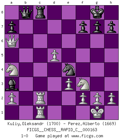 Last move : 1-0 2018 May 29 3:18:56 [Event "FICGS__CHESS__RAPID_C__000163"] [Site "FICGS"] [Date "2018.04.20"] [Round "1"] [White "Kuliy,Oleksandr"] [Black "Perez,Alberto"] [Result "1-0"] [WhiteElo "1700"] [BlackElo "1669"] 1.d4 d5 2.c4 e6 3.Nc3 c6 4.e3 Nf6 5.Nf3 Be7 6.Bd3 Nbd7 7.O-O O-O 8.b3 b6 9.Bb2 c5 10.Qe2 Bb7 11.Rfd1 Rc8 12.Rac1 Qc7 13.cxd5 exd5 14.dxc5 bxc5 15.Na4 Qb8 16.Bf5 Rfd8 17.Bxf6 Nxf6 18.Bxc8 Rxc8 19.Rc2 Ne4 20.Rdc1 c4 21.bxc4 Ba6 22.cxd5 Ba3 23.Qxa6 1-0 QGD : Semi-Slav Kingside Castling by player White (move 7) Kingside Castling by player Black (move 7) Player White won this chess game. Follow this game move after move (download)Chess is a fighting game which is purely intellectual and includes chance. (Richard Reti) Alles was ich jemals tun will ist Schach spielen. (Robert James Fischer) Las ideas audaces son como las piezas del Ajedrez que avanzan hacia adelante. Ellas pueden ser vencidas, pero también pueden iniciar una partida victoriosa. (Goethe) L'ordinateur a tué l'originalité. Il n'y a plus guère d'aventures sur l'échiquier. (Jacob Murray) If everyone is thinking alike, then somebody isn't thinking. (US General George S. Patton)