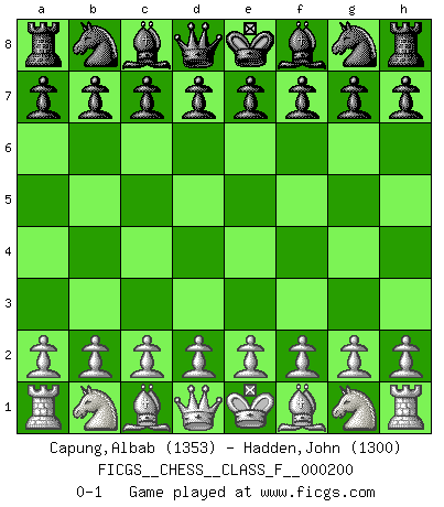 Last move : 0-1 2018 June 1 0:38:7 [Event "FICGS__CHESS__CLASS_F__000200"] [Site "FICGS"] [Date "2018.04.21"] [Round "1"] [White "Capung,Albab"] [Black "Hadden,John"] [Result "0-1"] [WhiteElo "1353"] [BlackElo "1300"] 0-1 This chess game has been lost on time (started : 2018.04.21 16:5:45) Player Black won this chess game. Follow this game move after move (download)Chess books should be used as we use glasses: to assist the sight, although some players make use of them as if they thought they conferred sight. (Jose Raul Capablanca) Wie bekannt hörte Morphy 1859 auf, Schach zu spielen. Seine Enttäuschung galt nicht so sehr dem Schach, wie den Schachspielern. (Robert James Fischer) Debemos de asegurarnos de que el Ajedrez no se convierta en un lenguaje muerto, muy interesante, pero tan solo para un grupo muy pequeño. (Sytze Faber) Je fais ceci parce que dans cinquante coups j'obtiendrai cela; je m'appelle Mikhail Moisevitch Botvinnik. (Botvinnik) A government big enough to give you everything you want is strong enough to take everything you have. (Thomas Jefferson)