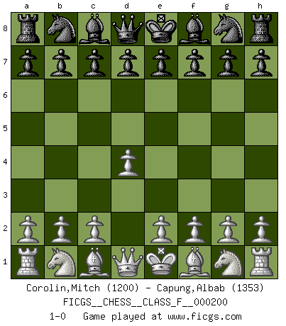 Last move : 1-0 2018 June 1 0:38:7 [Event "FICGS__CHESS__CLASS_F__000200"] [Site "FICGS"] [Date "2018.04.21"] [Round "1"] [White "Corolin,Mitch"] [Black "Capung,Albab"] [Result "1-0"] [WhiteElo "1200"] [BlackElo "1353"] 1.d4 1-0 This chess game has been lost on time (started : 2018.04.21 16:5:45) Queen's pawn Player White won this chess game. Follow this game move after move (download)Pawn endings are to Chess what putting is to golf. (Cecil Purdy) Fischer: 'Remis!?' Uhlmann: 'Aber es muss doch dreimal Zugwiederholung sein!' Fischer: 'Sie nehmen das Remis an, wie ich es sage, sonst spiele ich weiter und werde Sie dann schlagen!' (Robert James Fischer) Solo existe una cosa que Fischer hace en el Ajedrez sin placer: ¡perder!. (Boris Spassky) Si le désir cupide (et stupide) de gagner est une inépuisable source de souffrance, une combinaison brillante sur l'échiquier est une découverte : le coquelicot qui s'épanouit lorsque apparaît la Voie Lactée. (Arrabal) Gambling is the son of avarice and the father of despair. (French proverb)