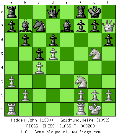 Last move : 1-0 2018 May 16 10:57:34 [Event "FICGS__CHESS__CLASS_F__000200"] [Site "FICGS"] [Date "2018.04.21"] [Round "1"] [White "Hadden,John"] [Black "Goldmund,Heike"] [Result "1-0"] [WhiteElo "1300"] [BlackElo "1092"] 1.d4 Nf6 2.c4 b6 3.Nc3 Bb7 4.e3 e6 5.Nf3 c5 6.Bd3 Be7 7.O-O Nc6 8.d5 Nb4 9.Bd2 Nxd3 10.Qc2 Nb4 11.Qc1 Nd3 12.Qc2 Nb4 13.Qb1 O-O 14.a3 Na6 15.e4 exd5 16.exd5 d6 17.Bg5 Nc7 18.Bxf6 Bxf6 19.Ne4 Be7 20.Neg5 h6 21.Qh7+ 1-0 Queen's Indian Accelerated Kingside Castling by player White (move 7) Kingside Castling by player Black (move 13) Player White won this chess game. Follow this game move after move (download)A passed Pawn increases in strength as the number of pieces on the board diminishes. (Capablanca) Herr Iljumschinow ist ein etwas merkwürdiger Geschäftsmann: Er arbeitet zusammen mit Leuten wie Muammar al-Gaddafi; früher ist das Saddam Hussein gewesen. (Joel Lautier) Vive, pierde y aprende al observar a tu oponente como gana. (Amber Steenbock) Aidez vos pièces, elles vous aideront. (Paul Morphy) There are three kinds of lies: lies, damned lies and statistics. (Mark Twain)