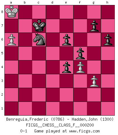 Last move : 0-1 2018 September 7 10:4:42 [Event "FICGS__CHESS__CLASS_F__000200"] [Site "FICGS"] [Date "2018.04.21"] [Round "1"] [White "Benreguia,Frederic"] [Black "Hadden,John"] [Result "0-1"] [WhiteElo "0786"] [BlackElo "1300"] 1.b4 d5 2.d4 e6 3.c3 Nc6 4.a4 Nf6 5.Bb2 Bd7 6.Nf3 Bd6 7.e3 O-O 8.b5 Ne7 9.c4 c6 10.c5 Bc7 11.bxc6 Bxc6 12.Bd3 Qb8 13.g3 b6 14.O-O bxc5 15.Qc2 cxd4 16.Nxd4 Ne4 17.Nxc6 Nxc6 18.Ba3 Nb4 19.Qd1 Rc8 20.f3 Nxd3 21.Qxd3 Nd6 22.Nc3 Ba5 23.Ne2 Nc4 24.Rab1 Qe5 25.Bc1 Bb6 26.Kg2 Bxe3 27.f4 Qe4+ 28.Qxe4 dxe4 29.Rd1 Bxc1 30.Rdxc1 Nb6 31.a5 Nc4 32.a6 Ne3+ 33.Kf2 Rxc1 34.Nxc1 Ng4+ 35.Ke2 Nxh2 36.Ke3 f5 37.Kd4 Nf3+ 38.Kc5 Kf7 39.Kc6 Re8 40.Kb7 Re7+ 41.Ka8 Nd4 42.Rb7 Nc6 43.Rxe7+ Kxe7 44.Kb7 Kd7 45.Ne2 h6 46.Nd4 Nxd4 47.Kxa7 Kc7 48.Ka8 Nc6 0-1 Polish (Sokolsky) opening Kingside Castling by player Black (move 7) Kingside Castling by player White (move 14) Player Black won this chess game. Follow this game move after move (download)Mistrust is the most necessary characteristic of the Chess player. (Siegbert Tarrasch) Kasparov stellt für gewöhnlich die Regeln auf und bricht sie dann selbst wieder. (Alexej Shirov) Cuando tengo las piezas blancas, yo gano porque soy blanco; Cuando tengo las piezas negras, yo gano porque soy Bogolyubov. (Bogolyubov) Le jeu d'échecs est comme rejeté hors du temps. (Antoine de Saint-Exupéry) Now the reason the enlightened prince and the wise general conquer the enemy whenever they move and their achievements surpass those of ordinary men is foreknowledge. (Sun Tzu)