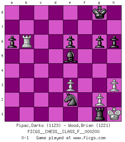 Last move : 0-1 2018 July 8 4:37:53 [Event "FICGS__CHESS__CLASS_F__000200"] [Site "FICGS"] [Date "2018.04.21"] [Round "1"] [White "Pipac,Darko"] [Black "Wood,Brian"] [Result "0-1"] [WhiteElo "1123"] [BlackElo "1221"] 1.e4 c5 2.Nf3 d6 3.h3 Nf6 4.Bb5+ Bd7 5.Bxd7+ Qxd7 6.Nc3 g6 7.d4 cxd4 8.Qxd4 Nc6 9.Qd3 Bg7 10.O-O O-O 11.a3 Qc8 12.Bg5 Nd7 13.Rfe1 Nc5 14.Qc4 Qe6 15.Qxe6 Nxe6 16.Nd5 Nxg5 17.Nxg5 h6 18.Nf3 e6 19.Nc7 Rab8 20.Rab1 a6 21.Re3 Rbc8 22.Nxe6 fxe6 23.c3 Na5 24.e5 Nc4 25.Rd3 dxe5 26.R3d1 Rcd8 27.a4 Rxd1+ 28.Rxd1 Nxb2 29.Rd7 Nxa4 30.Rxb7 Nxc3 31.Rb6 e4 32.Nd2 e3 33.fxe3 Ne2+ 34.Kh2 Be5+ 35.Kh1 Rd8 36.Nf3 Rd1+ 37.Ng1 Rxg1+ 0-1 Sicilian Kingside Castling by player White (move 10) Kingside Castling by player Black (move 10) Player Black won this chess game. Follow this game move after move (download)The hardest game to win is a won game. (Emanuel Lasker) Ja, ich habe einmal eine Blitzpartie gespielt, es war in einem Zug, 1929. --im Interview 1989 (Mikhail Moiseyevich Botvinik) Dejen al perfeccionista jugar por correo. (Yasser Seirawan) Vous m'avez demandé de vous exposer quel est le fondement de la prière. Je ne fais que préparer les pièces du jeu sur la table... Nous sera-t-il permis d'en adopter les règles et si nous les appliquons scrupuleusement nous ne tarderons pas à faire mat le Roi divin ! Il ne pourra échapper à nos mains. (Sainte Thérèse d'Avila, Chemin de perfection) Children in the dark cause accidents, accidents in the dark cause children. (Unknown)
