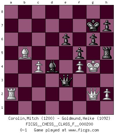 Last move : 0-1 2018 June 3 21:9:20 [Event "FICGS__CHESS__CLASS_F__000200"] [Site "FICGS"] [Date "2018.04.21"] [Round "1"] [White "Corolin,Mitch"] [Black "Goldmund,Heike"] [Result "0-1"] [WhiteElo "1200"] [BlackElo "1092"] 1.d4 Nf6 2.Nf3 b6 3.Bf4 Bb7 4.Nc3 e6 5.Nb5 a6 6.Nxc7+ Ke7 7.Nxa8 Bxa8 8.Be5 Nc6 9.e3 Nxe5 10.Nxe5 b5 11.a4 g6 12.axb5 axb5 13.Bxb5 Bxg2 14.Rg1 Be4 15.f3 Bb7 16.Ra7 Qb6 17.Rxb7 Qxb7 18.c4 Bg7 19.Qa4 d6 20.Nc6+ Kf8 21.Kf2 Ne8 22.Ne5 dxe5 23.Bxe8 Qxb2+ 24.Kg3 exd4 25.exd4 Bxd4 26.Rg2 Be5+ 27.Kh3 Qc3 28.Bc6 Kg7 29.Rc2 Qd3 30.Kg2 Rc8 31.Ra2 Qe3 32.Bb5 Qg5+ 33.Kh1 Qc1+ 34.Kg2 Bd4 35.Qc2 Qg1+ 36.Kh3 Rc5 37.Qg2 Rh5+ 38.Kg4 Qe3 39.f4 f5+ 0-1 Queen's Indian defense Player Black won this chess game. Follow this game move after move (download)The most important feature of the Chess position is the activity of the pieces. This is absolutely fundamental in all phases of the game: Opening, Middlegame and especially Endgame. The primary constraint on a piece's activity is the Pawn structure. (Michael Stean) Kleine Schachspieler machen Mist, und große Schachspieler machen Mist, aber große machen weniger Mist. (Fritz Sämisch) El Ajedrez es 99 por ciento táctica. (Teichmann) Dans le domaine de la peinture, de la gravure et de la sculpture, dès la première décennie de notre siècle, les artistes abandonnent la représentation de la partie d'échecs pour se concentrer sur les pièces, sur les échiquiers et sur toutes les variations auxquelles les unes et les autres peuvent donner lieu. On passe en quelque sorte d'un thème social à un thème musical (au sens de la musica médiévale, c'est-à-dire d'une notion qui inclue le rythme, l'harmonie, la construction et la déconstruction, etc.). Graphiquement et picturalement, l'échiquier apparaît comme une structure ouverte, dynamique, d'une richesse infinie, autorisant toutes les combinatoires et débouchant sur des mouvements et des rythmes de nature exponentielle. (Michel Pastoureau) Unless in communicating with it one says exactly what one means, trouble is bound to result. (Alan Turing, about computers)