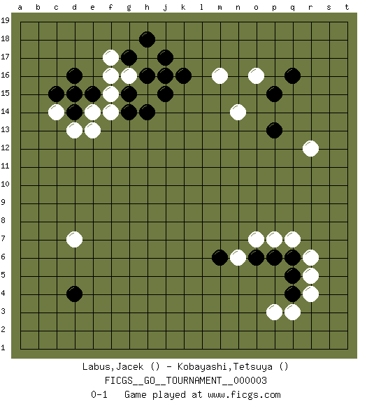 Last move : 0-1 2006 August 15 5:50:41 [Event "FICGS__GO__TOURNAMENT__000003 "] [Site "FICGS"] [Date "2006.06.03"] [Round "1"] [Black "Labus,Jacek "] [White "Kobayashi,Tetsuya "] [Result "0-1"] 1.d16 p3 2.q5 r4 3.q4 q3 4.q16 r5 5.q6 r6 6.d4 c14 7.d14 d13 8.c15 e14 9.d15 e13 10.k16 h17 11.h16 g16 12.j17 h15 13.j16 f15 14.e15 o16 15.p15 m16 16.g17 f17 17.h18 n14 18.p13 r12 19.g14 f14 20.g15 f16 21.h14 q7 22.p6 p7 23.j15 d7 24.o6 o7 25.m6 n6 0-1 This go game has been lost on time (started : 2006.06.03 13:0:3) Here are the names of the openings (joseki) played in the four corners : Corner q4 : p3 q5Mokuhazushi (Waemok, Wai`mu`) 5-3 Point. The mokuhazushi (5-3) point was popular in the Edo period in Japan (1600 - 1867). It emphasizes influence; territorially, it is inferior to the 3-4 point.Takamoku Kakari. Black prevents White from gaining influence, but in the local context, abandoning profit in the corner entails a loss. White 3-4 and 4-4 are best. Corner d16 : d16 c14Hoshi (Hwajeom, Seongjeom, Xingwei`) 4-4 Point. The star or hoshi (4-4) point, emphasizing influence at the potential expense of territory.Ikken Kakari (Hankan Keolch'im, Yi Gua`jiao~, 1-Space Low Approach). White 2 is the standard approach move to the 4-4. Corner q16 : q16 o16Hoshi (Hwajeom, Seongjeom, Xingwei`) 4-4 Point. The star or hoshi (4-4) point, emphasizing influence at the potential expense of territory.Ikken Takagakari (Hankan Nop'dakeolch'im, Yi Gaojia, 1-Space High Approach). Black typically responds at 6-4 or 3-10. Black 4-10 is played when Black finds play on the right side advantageous. Black 4-8 or 3-8 may be played when Black has support at top. Corner d4 : d4 d7Hoshi (Hwajeom, Seongjeom, Xingwei`) 4-4 Point. The star or hoshi (4-4) point, emphasizing influence at the potential expense of territory.Nikken Takagakari (Dukan Nop'dakeolch'im, E`r Gaojia, 2-Space High Approach). White 2 is a light approach move. Rarely played in even games, White 2 is typically employed in handicap games. Black continues with 6-4 or 3-10. In Korean Sunjang Baduk Black has a stone on 8-4. Player White won this Go (weiqi, baduk) game.Follow this game move after move (download ) Territory is a closed space where time no longer exists. The transformation around it slower alter it, and sometimes it cracks open like a rotten egg at the least shock. (Pierre Audouard) In fact if nothing is done against this teddy bear, hereby I announce that I would quit chess, rapid chess, blitz chess, postal chess, email chess, server chess and correspondence chess I will then switch to a table game where teddy bears aren't going to be seen for a while, like Poker, or Roulette, all 18+ games. (Elmer Valderrama)