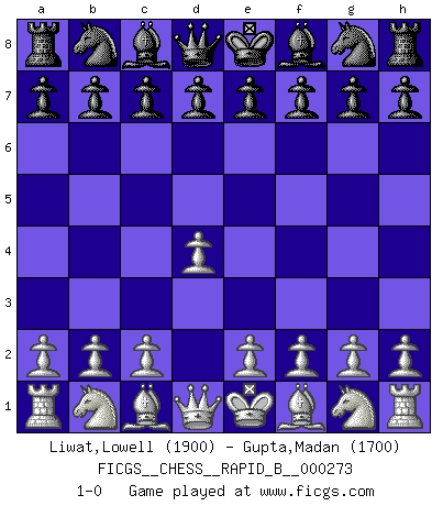 Last move : 1-0 2018 May 22 11:47:49 [Event "FICGS__CHESS__RAPID_B__000273"] [Site "FICGS"] [Date "2018.04.22"] [Round "1"] [White "Liwat,Lowell"] [Black "Gupta,Madan"] [Result "1-0"] [WhiteElo "1900"] [BlackElo "1700"] 1.d4 1-0 This chess game has been lost on time (started : 2018.04.22 0:52:44) Queen's pawn Player White won this chess game. Follow this game move after move (download)Dazzling combinations are for the many, shifting wood is for the few. (Georg Kieninger) Das Schach hält seine Meister in eigenen Banden, Fesseln; auf vielerlei Weise formt es ihren Geist, so dass die innere Freiheit selbst des Stärksten beeinflusst wird. (Albert Einstein) Muchos se han convertido en Maestros de Ajedrez, nadie se ha convertido en el Maestro del Ajedrez. (Siegbert Tarrasch) C'est une question de caractère, Beaucoup de gens perdent leur motivation très vite. D'autres, ils sont rares, peuvent la conserver très longtemps. J'aime les échecs, encore aujourd'hui je suis heureux d'analyser des parties. J'aime toujours gagner, je déteste encore perdre. Bien jouer est important pour mon intégrité intellectuelle et morale. Et puis les échecs vivent en ce moment une période historique grâce à Internet. Ils se développent dans les systèmes éducatifs à travers le monde. Ils sortent de leur ghetto, et c'est mon rôle de mener à bien cette révolution. (Gary Kasparov) It's not enough to succeed. Others must fail. (Gore Vidal)
