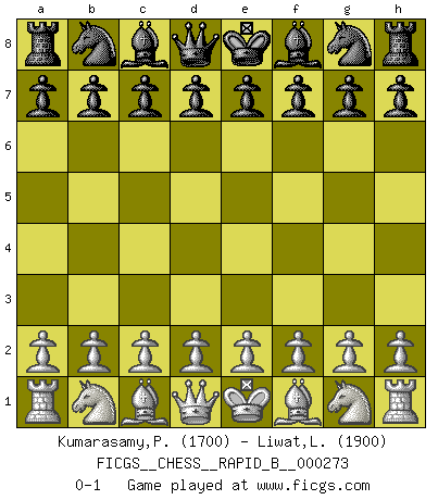 Last move : 0-1 2018 May 22 11:47:49 [Event "FICGS__CHESS__RAPID_B__000273"] [Site "FICGS"] [Date "2018.04.22"] [Round "1"] [White "Kumarasamy,Prabakaran"] [Black "Liwat,Lowell"] [Result "0-1"] [WhiteElo "1700"] [BlackElo "1900"] 0-1 This chess game has been lost on time (started : 2018.04.22 0:52:44) Player Black won this chess game. Follow this game move after move (download)Chess is so inspiring that I do not believe a good player is capable of having an evil thought during the game. (Wilhelm Steinitz) Schach ist die gewalttätigste aller Sportarten. (Garry Kasparov) Si el Ajedrez es una ciencia, es la mas inexacta. Si el Ajedrez es un arte, es demasiado inexacto para ser visto como tal. Si el Ajedrez es un deporte, es demasiado esotérico. Si el Ajedrez es un juego, es demasiado exigente para ser solo un juego. Si el Ajedrez es una aventura, es una muy demandante. Si el Ajedrez es una pasión, es una muy gratificante. Si el Ajedrez es la vida, es una muy triste. (Anónimo) Fischer est le meilleur joueur du monde et Karpov n'est qu'un joueur de bistrot. (Garry Kasparov, agé de 16 ans) Beep ! (R2D2 in Star Wars ep.3)