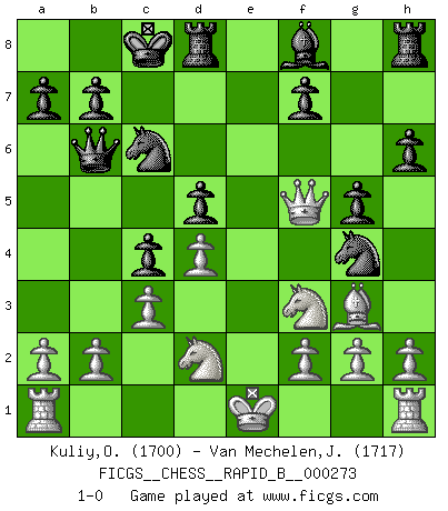 Last move : 1-0 2018 May 16 11:0:29 [Event "FICGS__CHESS__RAPID_B__000273"] [Site "FICGS"] [Date "2018.04.22"] [Round "1"] [White "Kuliy,Oleksandr"] [Black "Van Mechelen,Jan"] [Result "1-0"] [WhiteElo "1700"] [BlackElo "1717"] 1.d4 d5 2.Bf4 c5 3.e3 Nc6 4.c3 Nf6 5.Nd2 Qb6 6.Qb3 c4 7.Qc2 Nh5 8.Bg5 h6 9.Bh4 g5 10.Be2 Nf6 11.Bg3 Bg4 12.Bxg4 Nxg4 13.Ngf3 e6 14.e4 O-O-O 15.exd5 exd5 16.Qf5+ 1-0 Queen's pawn, Mason variation, Steinitz counter-gambit Queenside Castling by player Black (move 14) Player White won this chess game. Follow this game move after move (download)Chess is the art which expresses the science of logic. (Mikhail Botvinnik) Ich rechne überhaupt nicht voraus. Ich gewinne auch so. (Robert James Fischer) De todos mis libros Rusos, la defensa contiene y difunde el 'calor' mas grande que pudiese verse extraño al observar lo supremamente abstracto que el Ajedrez supuestamente es. (Vladimir Nabokov) Roi des jeux et jeu des rois, les échecs portent en eux un sentiment d'infini. Ils donnent à celui qui s'est efforcé d'en approfondir les arcanes l'impression de n'être pas à la mesure de l'homme; en fait, ils constituent un résumé de l'univers, un microcosme, et figurent cette grande échelle qui, dans les plans de la lumière descend jusqu'à la matière, qui des abîmes insondables remonte jusqu'en l'infini de Dieu. (Pyrame) It's not a bug - it's an undocumented feature. (Anonymous)