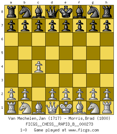 Last move : 1-0 2018 May 23 23:51:23 [Event "FICGS__CHESS__RAPID_B__000273"] [Site "FICGS"] [Date "2018.04.23"] [Round "1"] [White "Van Mechelen,Jan"] [Black "Morris,Brad"] [Result "1-0"] [WhiteElo "1717"] [BlackElo "1800"] 1.c4 1-0 This chess game has been lost on time (started : 2018.04.23 15:8:47) English Opening Player White won this chess game. Follow this game move after move (download)Everything is in a state of flux, and this includes the world of Chess. (Mikhail Botvinnik) Ich verstehe mehr vom Schach als irgendein anderer lebender Meister. (José Raúl Capablanca) Una partida de Ajedrez se divide en 3 etapas: la primera cuando piensas que tienes la ventaja, la segunda cuando crees que tienes la ventaja y la tercera... ¡cuando te das cuenta que vas a perder!. (Savielly Tartakower) Tout change constamment, y compris dans le monde des Echecs. (Botvinnik) Secret operations are essential in war; upon them the army relies to make its every move. (Sun Tzu)