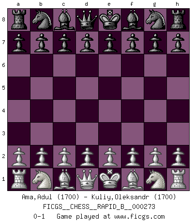 Last move : 0-1 2018 May 22 11:47:49 [Event "FICGS__CHESS__RAPID_B__000273"] [Site "FICGS"] [Date "2018.04.22"] [Round "1"] [White "Ama,Adul"] [Black "Kuliy,Oleksandr"] [Result "0-1"] [WhiteElo "1700"] [BlackElo "1700"] 0-1 This chess game has been lost on time (started : 2018.04.22 0:52:44) Player Black won this chess game. Follow this game move after move (download)We like to think. (Gary Kasparov) Je mehr ich von der FIDE weiss, um so weniger verstehe ich. (Alexander Kalifman) El Ajedrez es una manera fabulosa para que los niños aprendan a autovalorarse y a autoestimarse. (Saudin Robovic) Des points faibles ou des trous dans la position de l'adversaire doivent être occupés par des pièces et non pas par des pions. (Siegbert Tarrasch) See no evil, hear no evil, speak no evil. (The 3 monkeys)
