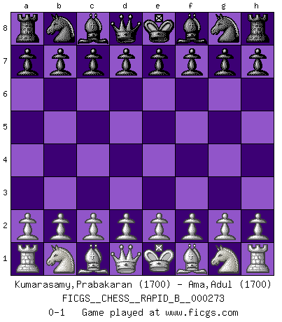 Last move : 0-1 2018 May 22 11:47:49 [Event "FICGS__CHESS__RAPID_B__000273"] [Site "FICGS"] [Date "2018.04.22"] [Round "1"] [White "Kumarasamy,Prabakaran"] [Black "Ama,Adul"] [Result "0-1"] [WhiteElo "1700"] [BlackElo "1700"] 0-1 This chess game has been lost on time (started : 2018.04.22 0:52:44) Player Black won this chess game. Follow this game move after move (download)When you don't know what to play, wait for an idea to come into your opponent's mind. You may be sure that idea will be wrong. (Siegbert Tarrasch) Ich weiss nicht was Gott gegen mich auf 1.e4 antworten würde. (Robert James Fischer) El Ajedrez es el gimnasio de la mente. (Blaise Pascal) Le pion, dans sa simplicité, marche droit devant lui, mais lorsqu'il prend, il le fait obliquement? Ainsi l'homme, tant qu'il reste pauvre, marche dans la droiture et vit honnêtement, mais lorsqu'il recherche les honneurs, il flatte, se parjure et, par les voies obliques, cherche une position supérieure sur l'échiquier du monde. (Jean de Galles) When I took office, only high energy physicists had ever heard of what is called the World Wide Web... Now even my cat has its own page. (Bill Clinton, 1996)