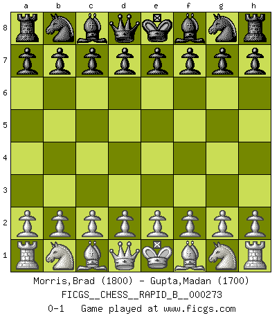 Last move : 0-1 2018 May 23 23:51:23 [Event "FICGS__CHESS__RAPID_B__000273"] [Site "FICGS"] [Date "2018.04.23"] [Round "1"] [White "Morris,Brad"] [Black "Gupta,Madan"] [Result "0-1"] [WhiteElo "1800"] [BlackElo "1700"] 0-1 This chess game has been lost on time (started : 2018.04.23 15:8:47) Player Black won this chess game. Follow this game move after move (download)A sacrifice is best refuted by accepting it. (Wilhelm Steinitz) Ich kenne keine einzige Person, die behaupten würde, Garri Kasparow sei ein guter Mensch (Nigel Short) Un jugador que es sorprendido, esta derrotado a medias. (Proverbio) Il vaut toujours mieux jouer un plan faux de façon logique que de n'avoir pas de plan du tout. (Victor Kortchnoï) It's not the will to win, but the will to prepare to win that makes the difference. (Bear Bryant)