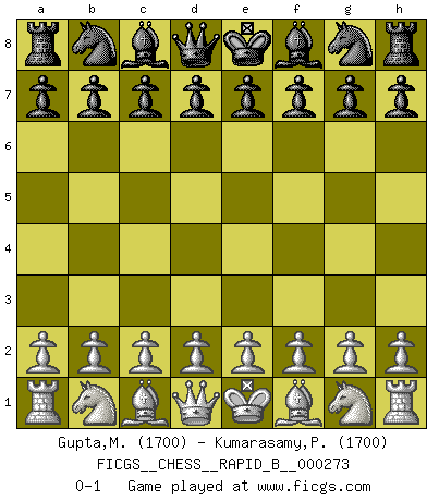Last move : 0-1 2018 May 22 11:47:49 [Event "FICGS__CHESS__RAPID_B__000273"] [Site "FICGS"] [Date "2018.04.22"] [Round "1"] [White "Gupta,Madan"] [Black "Kumarasamy,Prabakaran"] [Result "0-1"] [WhiteElo "1700"] [BlackElo "1700"] 0-1 This chess game has been lost on time (started : 2018.04.22 0:52:44) Player Black won this chess game. Follow this game move after move (download)Examine moves that smite! A good eye for smites is far more important than a knowledge of strategical principles. (Purdy) Schach ist ein Teil der Kultur, und wenn es mit der Kultur abwärts geht, geht es auch mit dem Schach abwärts. (Mikhail Moiseyevich Botvinik) Aún el Rey más flojo huye despavorido ante la amenaza de un Jaque doble. (Aaron Nimzowitsch) Les échecs, c'est l'imagination. (David Bronstein) The bottom line is always the bottom line. (Johann Piek)