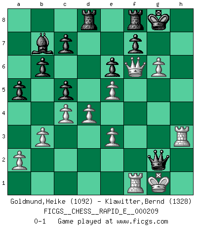 Last move : 0-1 2018 May 22 3:17:22 [Event "FICGS__CHESS__RAPID_E__000209"] [Site "FICGS"] [Date "2018.04.23"] [Round "1"] [White "Goldmund,Heike"] [Black "Klawitter,Bernd"] [Result "0-1"] [WhiteElo "1092"] [BlackElo "1328"] 1.e4 Nf6 2.e5 Nd5 3.d4 Nc6 4.Nf3 e6 5.Bb5 a6 6.Bxc6 dxc6 7.O-O Be7 8.Be3 Nxe3 9.fxe3 O-O 10.Qe1 h6 11.Nc3 a5 12.Ne4 b6 13.c4 Ba6 14.b3 Kh8 15.Qd2 Bb4 16.Qc2 Be7 17.Rf2 Bg5 18.Nexg5 hxg5 19.Nxg5 Qxg5 20.Rf3 g6 21.Raf1 Kg7 22.Qe4 Bb7 23.h4 Qh5 24.Qf4 Rad8 25.Qf6+ Kg8 26.Rh3 Qe2 27.h5 c5 28.hxg6 Qxg2+ 0-1 Alekhine's defense Kingside Castling by player White (move 7) Kingside Castling by player Black (move 9) Player Black won this chess game. Follow this game move after move (download)No one ever won a game by resigning. (Unknown) Der Schachmeister von Heute braucht Courage, einen Killerinstinkt, Ausdauer und Arroganz. (Larry Evans) Repentinamente, me resultaba obvio en mi analisis que yo había pasado por alto lo que Fischer había visto en el tablero con la mas grande facilidad. (Mikhail Botvinnik) Les Echecs ne sont pas pour les âmes timides. Ils requièrent un homme entier, qui ne s'arrête pas aveuglément à ce qui a été déjà établi, mais qui tente individuellement de sonder les profondeurs du jeu. (W. Steinitz) Life is painting a picture, not doing a sum. (Oliver Wendell Holmes, Jr.)