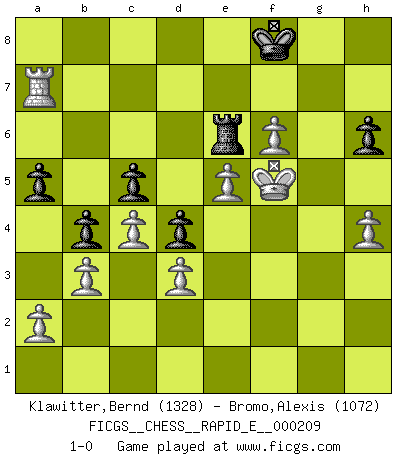 Last move : 1-0 2018 May 22 7:55:22 [Event "FICGS__CHESS__RAPID_E__000209"] [Site "FICGS"] [Date "2018.04.23"] [Round "1"] [White "Klawitter,Bernd"] [Black "Bromo,Alexis"] [Result "1-0"] [WhiteElo "1328"] [BlackElo "1072"] 1.e4 e5 2.Nf3 Nc6 3.Bb5 d6 4.O-O Bd7 5.c3 a6 6.Ba4 b5 7.Bc2 h6 8.d3 Nf6 9.h3 Be7 10.Re1 O-O 11.Nbd2 b4 12.c4 Nd4 13.Nxd4 exd4 14.Nf3 c5 15.b3 Re8 16.Bf4 Bc6 17.Qd2 Nh7 18.Bh2 Bg5 19.Nxg5 Nxg5 20.Qf4 Bb7 21.Qxd6 Qxd6 22.Bxd6 Rac8 23.Bh2 Rc6 24.f3 Rg6 25.Kf1 Ne6 26.Bd1 Bc8 27.f4 Nxf4 28.Bxf4 Rf6 29.g3 g5 30.Kg2 gxf4 31.gxf4 Kh7 32.f5 Rg8+ 33.Kh2 Bd7 34.Bf3 Be8 35.Rg1 Rxg1 36.Rxg1 a5 37.Bd1 Bd7 38.Kg3 Kh8 39.Kf4 Rc6 40.Bf3 Be8 41.e5 Rc7 42.f6 Bd7 43.h4 Bc6 44.Bxc6 Rxc6 45.Rg7 Re6 46.Rxf7 Kg8 47.Ra7 Kf8 48.Kf5 1-0 Ruy Lopez : Old Steinitz defense Kingside Castling by player White (move 4) Kingside Castling by player Black (move 10) Player White won this chess game. Follow this game move after move (download)Robert Fischer is a law unto himself. (Larry Evans) Schachspieler können ausgezeichnet Varianten am Schachbrett berechnen, aber nicht im realen Leben. Zu stark ist der Individualismus im Schach ausgeprägt, und für viele ist ein kleiner momentaner persönlicher Vorteil wichtiger als ein weit größerer Vorteil von morgen. (Anatoly Karpov) Alekhine es un poeta que crea un trabajo de arte de algo que raramente inspiraría a otra persona a mandar una tarjeta postal. (Max Euwe) Fischer est le meilleur joueur du monde et Karpov n'est qu'un joueur de bistrot. (Garry Kasparov, agé de 16 ans) You must do what you feel is right... of course. (Obi-Wan Kenobi in Star Wars ep.4)