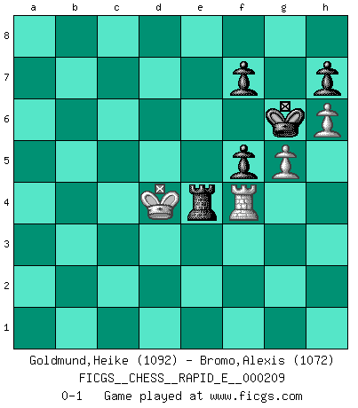 Last move : 0-1 2018 May 12 20:33:20 [Event "FICGS__CHESS__RAPID_E__000209"] [Site "FICGS"] [Date "2018.04.23"] [Round "1"] [White "Goldmund,Heike"] [Black "Bromo,Alexis"] [Result "0-1"] [WhiteElo "1092"] [BlackElo "1072"] 1.d4 d5 2.Nf3 Bg4 3.e3 e6 4.c4 Nf6 5.Nbd2 Bb4 6.Qb3 Bxd2+ 7.Nxd2 O-O 8.Qxb7 Nbd7 9.cxd5 exd5 10.h3 Bf5 11.Nf3 Qc8 12.Qxc8 Rfxc8 13.g4 Be4 14.Bg2 Bxf3 15.Bxf3 c6 16.b3 c5 17.Bb2 cxd4 18.Bxd4 Ne4 19.Be2 Ndc5 20.O-O Ne6 21.Be5 N6g5 22.Kg2 Re8 23.Bf4 Rac8 24.Rfc1 Nc3 25.Bd3 Nge4 26.f3 Nf6 27.Rc2 d4 28.exd4 Ncd5 29.Be5 Rxc2+ 30.Bxc2 Ne3+ 31.Kg3 Nxc2 32.Rc1 Nb4 33.a4 Nd3 34.Rc7 a6 35.Bxf6 gxf6 36.Ra7 Nb4 37.Rb7 a5 38.Ra7 Nc6 39.Ra6 Nxd4 40.Rxa5 Nxb3 41.Rb5 Ra8 42.h4 Rxa4 43.h5 Nd4 44.Rb6 Kg7 45.f4 Ra3+ 46.Kh4 Ne6 47.Rb4 Ra1 48.g5 f5 49.h6+ Kg6 50.Kg3 Rg1+ 51.Kf3 Rf1+ 52.Ke3 Nxf4 53.Rxf4 Re1+ 54.Kd4 Re4+ 0-1 Queen's pawn game Kingside Castling by player Black (move 7) Kingside Castling by player White (move 20) 10 pieces endgame at move 52 : White KRPP , Black KRNPPP WHITE : King + 1 Rook 2 Pawns BLACK : King + 1 Rook 1 Knight 3 Pawns 9 pieces endgame at move 53 : White KRPP , Black KRPPP WHITE : King + 1 Rook 2 Pawns BLACK : King + 1 Rook 3 Pawns Player Black won this chess game. Follow this game move after move (download)Chess is a foolish expedient for making idle people believe they are doing something very clever when they are only wasting their time. (George Bernard Shaw) Schach ist das schnellste Spiel der Welt, weil man in jeder Sekunde Tausende von Gedanken ordnen muß. (Albert Einstein) Un jugador que trata de regresar una movida en el Ajedrez es un futuro carterista. (Richard Fenton) Le pion, dans sa simplicité, marche droit devant lui, mais lorsqu'il prend, il le fait obliquement? Ainsi l'homme, tant qu'il reste pauvre, marche dans la droiture et vit honnêtement, mais lorsqu'il recherche les honneurs, il flatte, se parjure et, par les voies obliques, cherche une position supérieure sur l'échiquier du monde. (Jean de Galles) All art requires courage. (Anne Tucker)
