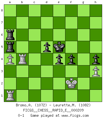 Last move : 0-1 2018 May 2 19:36:8 [Event "FICGS__CHESS__RAPID_E__000209"] [Site "FICGS"] [Date "2018.04.23"] [Round "1"] [White "Bromo,Alexis"] [Black "Leurette,Marc-Antoine"] [Result "0-1"] [WhiteElo "1072"] [BlackElo "1082"] 1.e4 e5 2.Nf3 Nc6 3.Bb5 Nf6 4.d3 Bc5 5.h3 d6 6.O-O a6 7.Bxc6+ bxc6 8.Nc3 O-O 9.a3 Re8 10.Re1 a5 11.Bg5 h6 12.Bxf6 Qxf6 13.Ne2 d5 14.exd5 cxd5 15.Ng3 Bd6 16.d4 e4 17.Nd2 Qxd4 18.Kh1 Bxg3 19.fxg3 Be6 20.c3 Qe5 21.Rf1 Qxg3 22.Qh5 Kh7 23.Rae1 Qg6 24.Qxg6+ Kxg6 25.c4 c6 26.cxd5 cxd5 27.Nb3 a4 28.Nc5 f5 29.Ra1 Ra5 30.b4 axb3 31.Nxb3 Ra4 32.Nc5 Ra5 33.Nxe6 Rxe6 34.Kh2 Kf6 35.Rfb1 g5 36.a4 Rea6 37.Rb4 h5 38.g3 Ke5 39.Kg2 f4 40.gxf4+ gxf4 41.Kf2 h4 0-1 Ruy Lopez : Berlin defense Kingside Castling by player White (move 6) Kingside Castling by player Black (move 8) Player Black won this chess game. Follow this game move after move (download)A win by an unsound combination, however showy, fills me with artistic horror. (Wilhelm Steinitz) Kritik überlasse ich den Spießern. Ich zeige nichts, wofür ich mich schämen muss. (Alexandra Kosteniuk) Si un gobernante no entiende al Ajedrez, ¿como puede governar él un reinado?. (El Rey Khusros II) Il vaut mieux sacrifier les pièces de l'adversaire. (Xavier Tartacover) Think like a man of action, act like a man of thought. (Henri Louis Bergson)