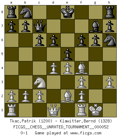 Last move : 0-1 2018 July 17 19:54:17 [Event "FICGS__CHESS__UNRATED_TOURNAMENT__000052"] [Site "FICGS"] [Date "2018.04.23"] [Round "1"] [White "Tkac,Patrik"] [Black "Klawitter,Bernd"] [Result "0-1"] [WhiteElo "1200"] [BlackElo "1328"] 1.e4 c6 2.Be2 d6 3.Nf3 g6 4.O-O Bg7 5.Nc3 Qc7 6.d3 Bg4 7.d4 f6 8.h3 Bxf3 9.gxf3 Nh6 10.Bf4 e5 0-1 This chess game has been lost on time (started : 2018.04.23 11:51:36) Caro-Kann defense Kingside Castling by player White (move 4) Player Black won this chess game. Follow this game move after move (download)Mistrust is the most necessary characteristic of the Chess player. (Siegbert Tarrasch) Über die Verhaftung Bobby Fischers: Warum es die Bush-Administration für nötig befindet einen 61 Jahre alten Mann zu hetzten, der für niemanden ausser sich selbste eine Gefahr darstellt ist ein Rätsel. (Nigel Short) Los Peones son nacidos libres, y aún así, se encuentran por doquier encadenados. (Rick Kennedy) Les pièces de l'échiquier étaient impitoyables. Elles le retenaient, elles l'absorbaient. Il y avait de l'horreur en cela, mais aussi une harmonie unique. Car, qu'y a-t-il dans le monde, à part les échecs ? (V. Nabokov) Perhaps chess is the wrong game for the times (The Chess Master and the Computer, by Garry Kasparov - 2010)