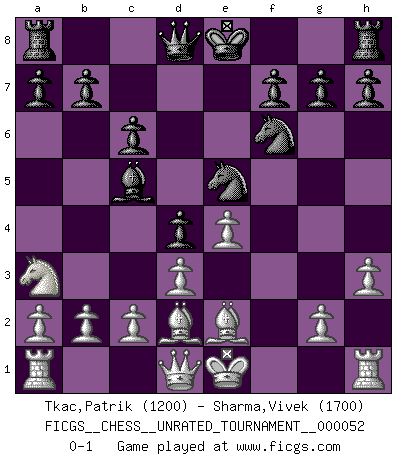Last move : 0-1 2018 July 16 7:44:55 [Event "FICGS__CHESS__UNRATED_TOURNAMENT__000052"] [Site "FICGS"] [Date "2018.04.23"] [Round "1"] [White "Tkac,Patrik"] [Black "Sharma,Vivek"] [Result "0-1"] [WhiteElo "1200"] [BlackElo "1700"] 1.e4 d5 2.d3 e5 3.f3 d4 4.Bd2 Nc6 5.f4 Nf6 6.fxe5 Nxe5 7.Na3 Bg4 8.Ne2 c6 9.h3 Bxe2 10.Bxe2 Bc5 0-1 This chess game has been lost on time (started : 2018.04.23 11:51:36) Scandinavian (centre counter) defense Player Black won this chess game. Follow this game move after move (download)Different people feel differently about resigning. (Bobby Fischer) Das Zentrum ist der Balkan des Schachbretts - Kriegshandlungen können in jedem Moment ausbrechen. (Aaron Nimzowitsch) No hay precio que sea tan grande por la cabellera del Rey enemigo. (Koblentz) La solitude du joueur d'Echecs à l'approche du mat est semblable à celle du condamné. (Francis Szpiner) Whatever you do, don't be bored. This is absolutely the most exciting time we could have possibly hoped to be alive. And things are just starting. (From movie Waking life)