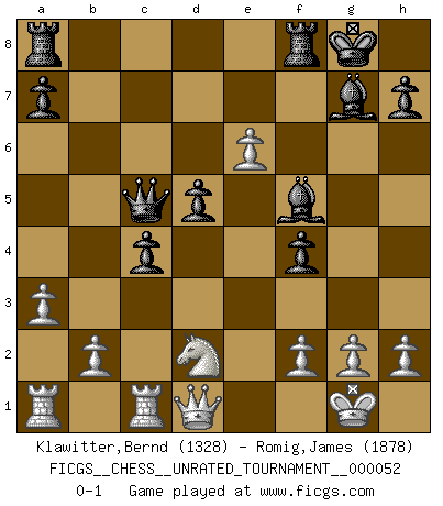 Last move : 0-1 2018 May 6 19:49:16 [Event "FICGS__CHESS__UNRATED_TOURNAMENT__000052"] [Site "FICGS"] [Date "2018.04.23"] [Round "1"] [White "Klawitter,Bernd"] [Black "Romig,James"] [Result "0-1"] [WhiteElo "1328"] [BlackElo "1878"] 1.d4 Nf6 2.Bg5 c5 3.Bxf6 gxf6 4.d5 Bg7 5.c3 d6 6.e4 f5 7.Bd3 Qb6 8.Qc2 fxe4 9.Bxe4 Nd7 10.Ne2 Nf6 11.Ng3 Nxe4 12.Nxe4 Qa6 13.Nbd2 f5 14.Ng3 O-O 15.c4 f4 16.Nge4 b5 17.O-O Bf5 18.a3 bxc4 19.Rfc1 e6 20.dxe6 d5 21.Nxc5 Qc6 22.Qd1 Qxc5 0-1 Trompowsky attack (Ruth, Opovcensky Opening) Kingside Castling by player Black (move 14) Kingside Castling by player White (move 17) Player Black won this chess game. Follow this game move after move (download)Fischer wanted to give the Russians a taste of their own medicine. (Larry Evans) Ich kenne Menschen, die allen Willen der Welt besitzen und doch nicht Schach spielen können. (Robert James Fischer) Fischer no está bajo la obligación de nadie. (Joseph Platz) Les échecs, c'est la lutte contre l'erreur. (Johannes Zukertort) Shallow men believe in luck. Strong men belive in cause and effect. (Ralph Waldo Emerson)